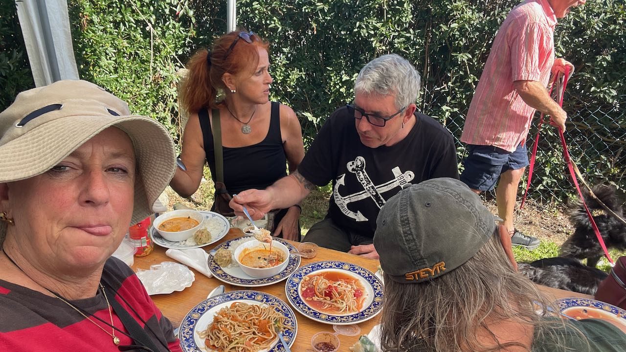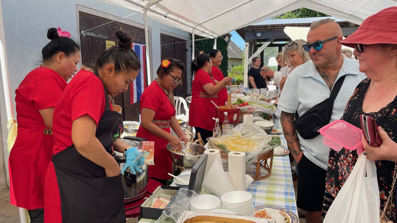 Zuerst ein Brötchen mit selbstgeräuchertem Fisch, dann knusprige Frühlingsrollen. Ein indisches Curry hinterher und zum Abschluß eine kleine Kuchenplatte. Exzellent!