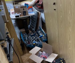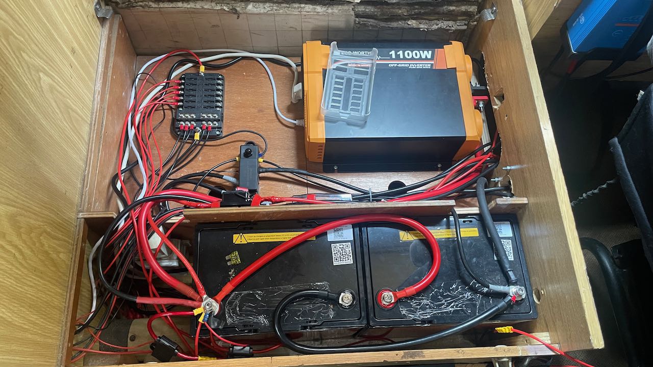 Wir bleiben. Martin baut den Sitz aus und die neue Batterie ein, ersetzt dann noch ein paar Türgriffe und Scheibenwischer und baut eine neue USB-Ladestation im Dash ein. Voll im Arbeitsflow…