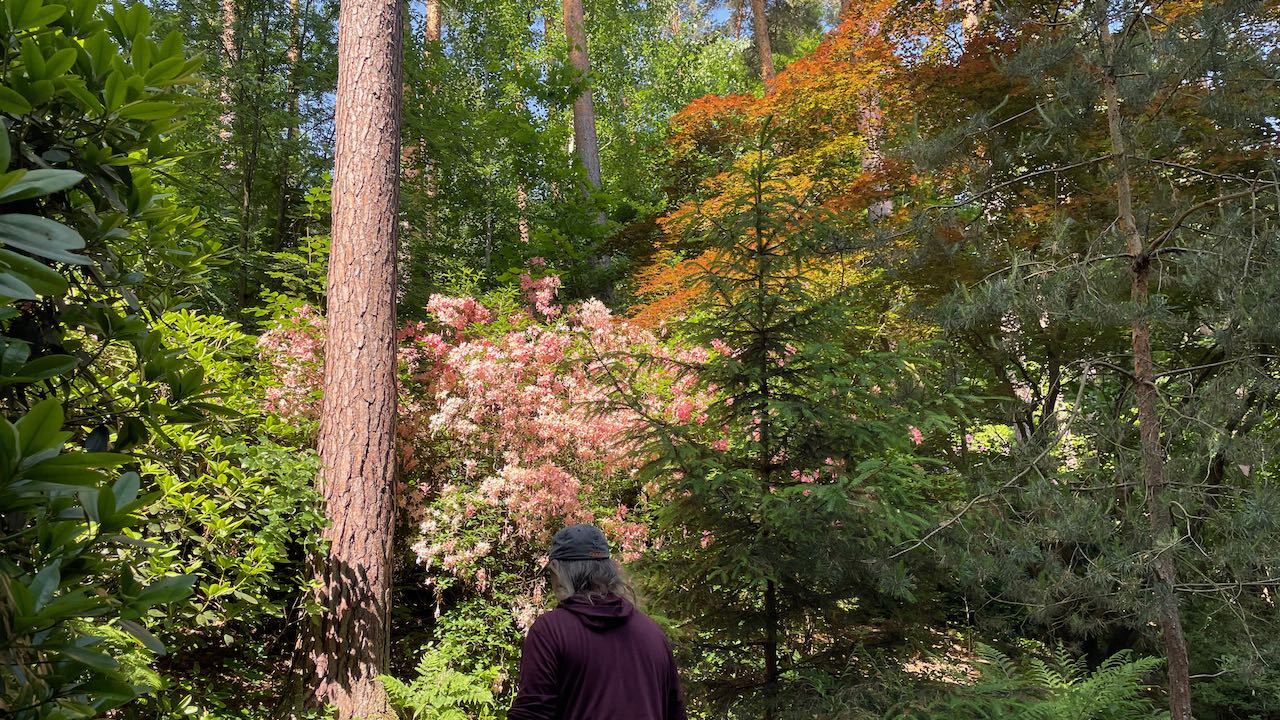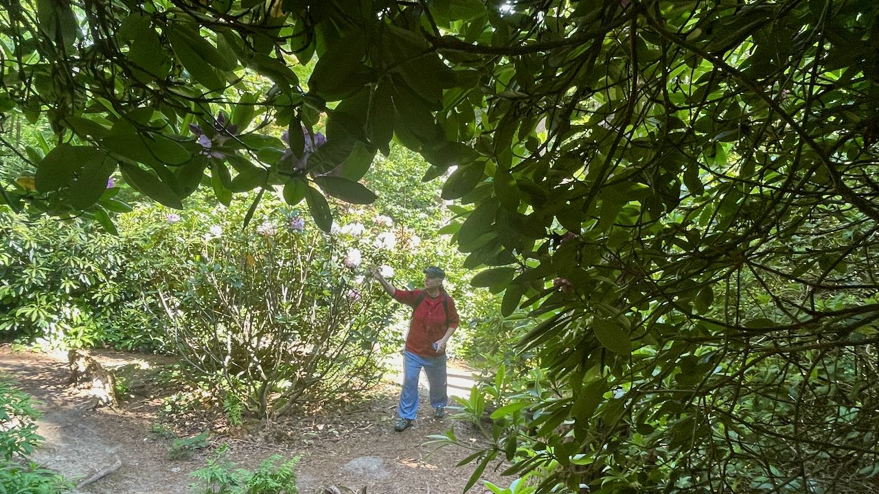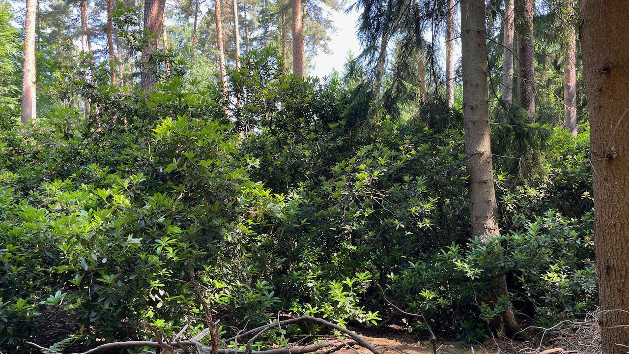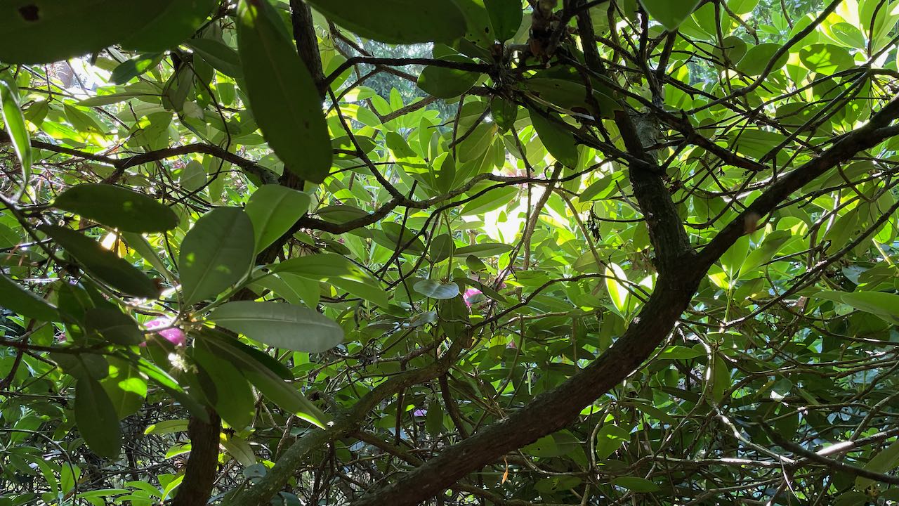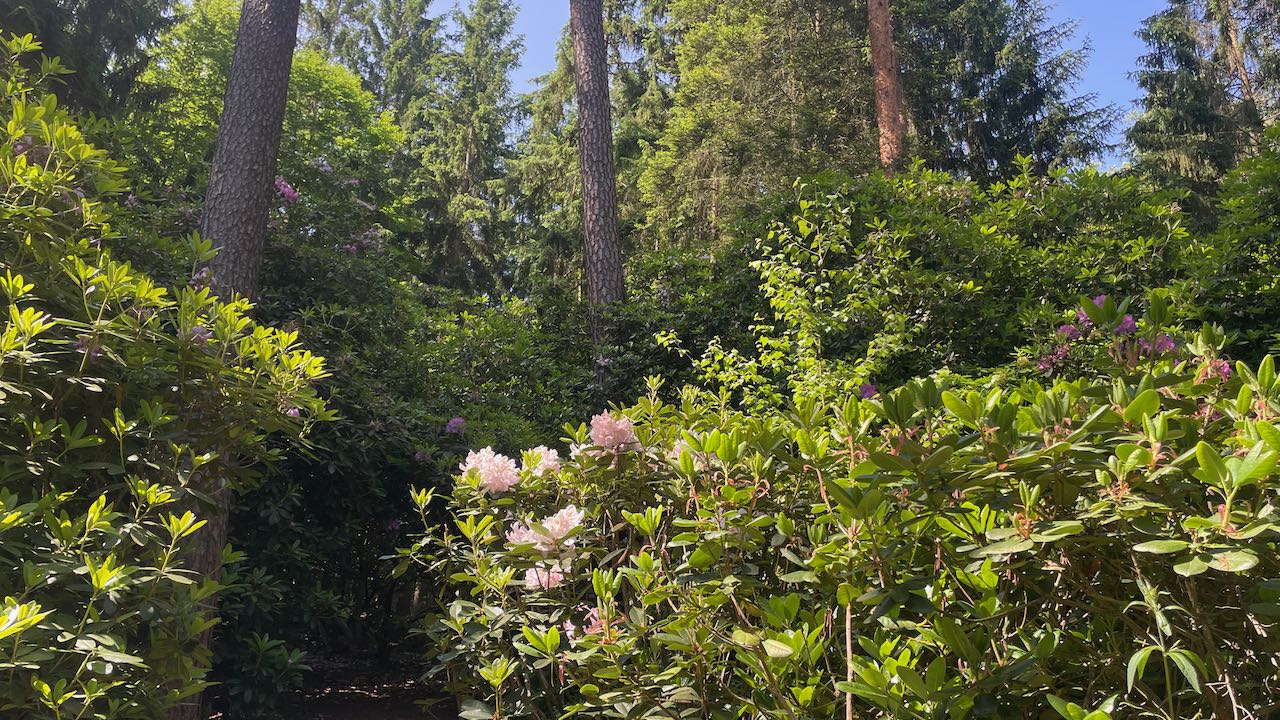 Beinah zugewachsene Wege führen durch das grüne Dickicht der Rhododendren