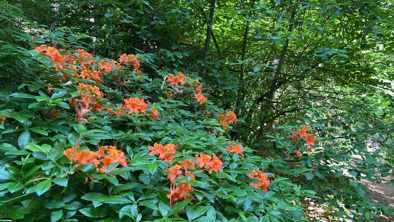 Mitten im Wald leuchten die farbenfrohen Blüten zwischen den Bäumen
