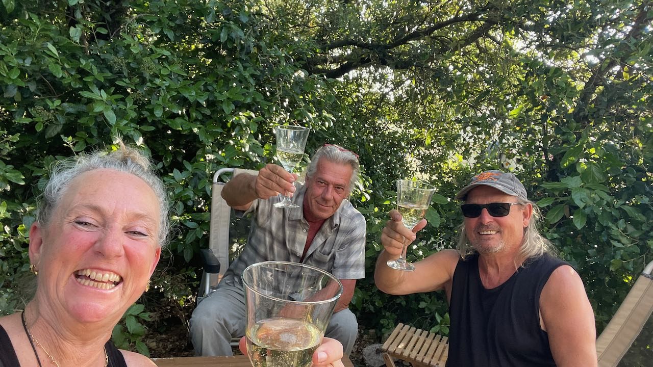 Der beschwingte Chef lädt uns ein zu zwei Gläsern Rosé, Santé!