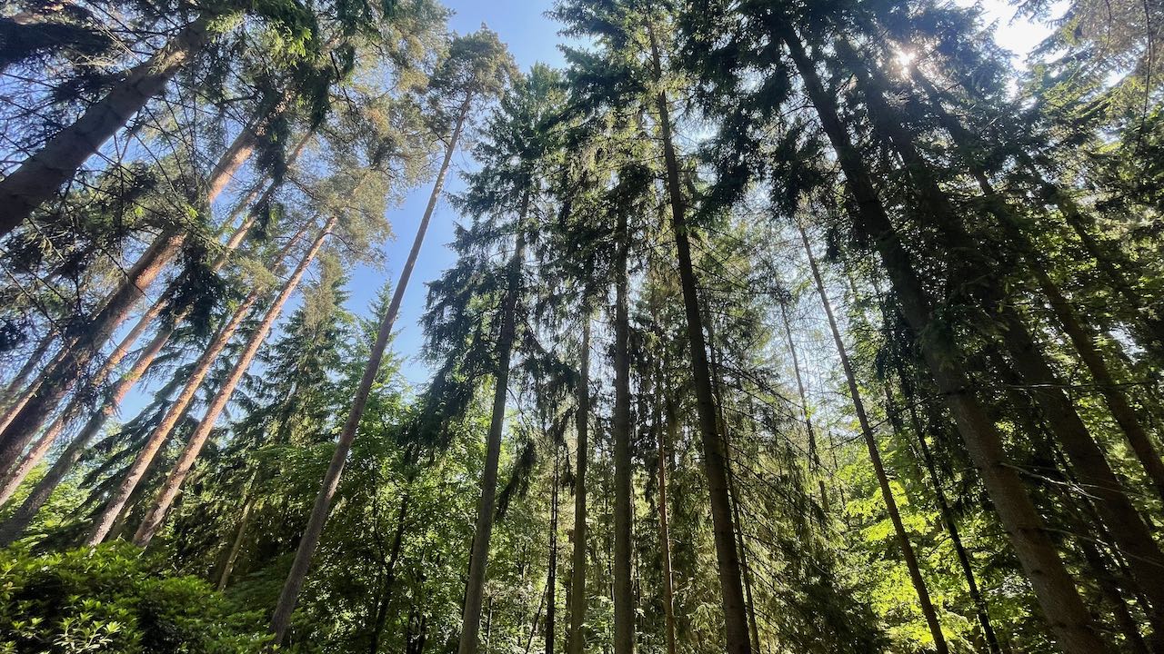 Kerzengerade ragen Fichten in den Himmel, lange, dünne Stängel, fest im Boden verankert mit grün bemoosten Wurzeln