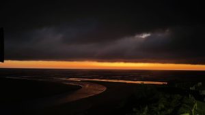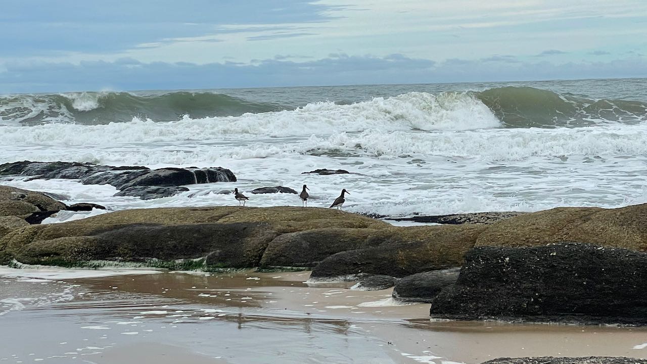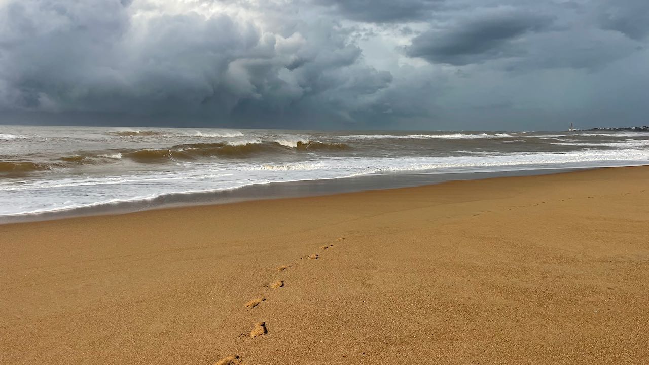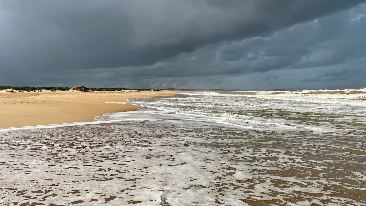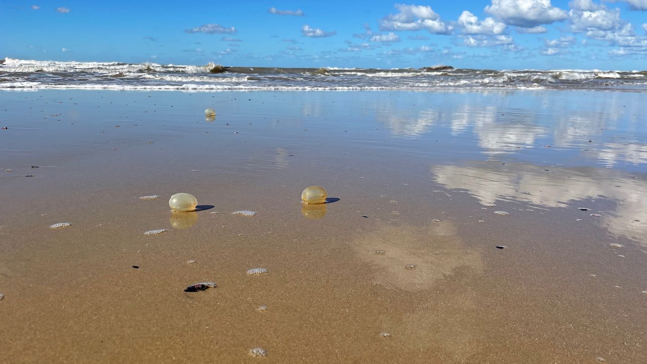 Ich geh nochmal runter zum Strand. Dunkelgraue Sturmwolken bauschen sich am Himmel, Bronzekiebitze und Austernfischer fliegen auf, kleine Quallen schmelzen im Sand.