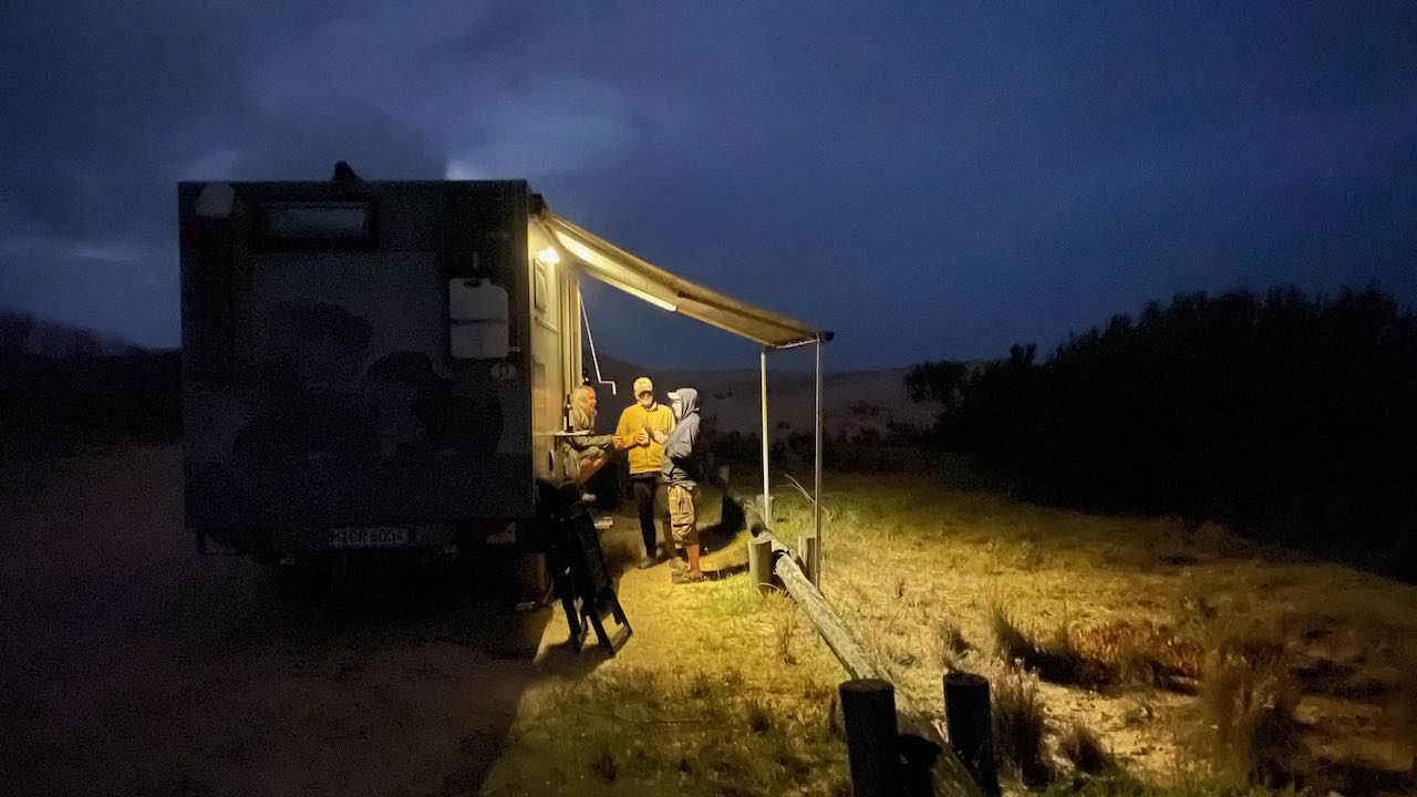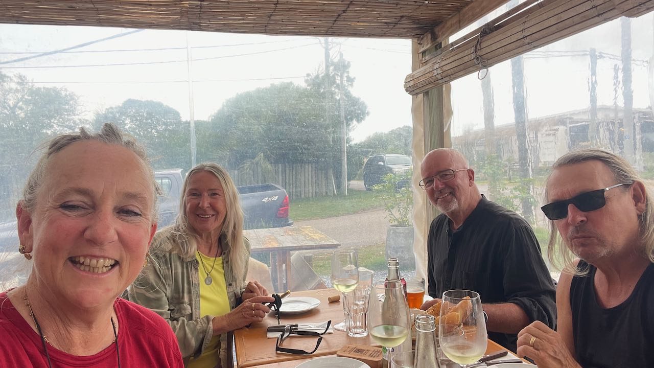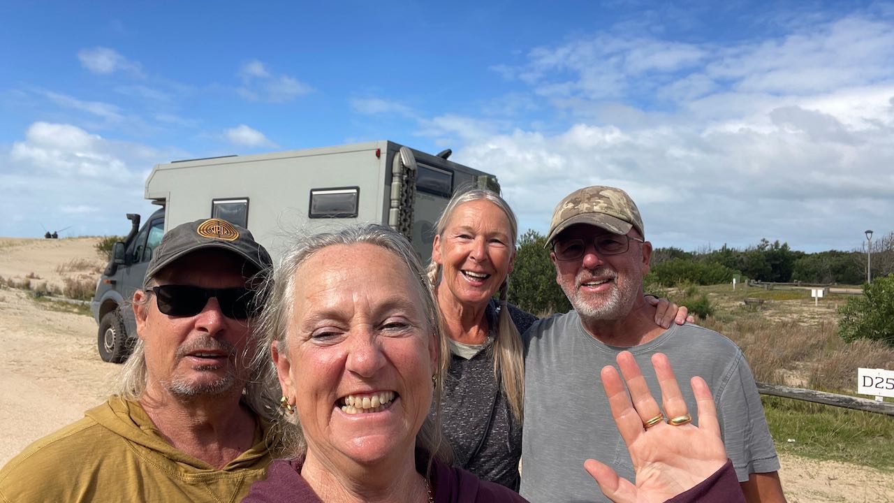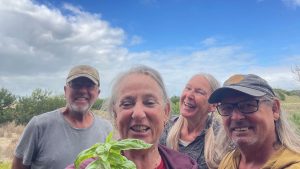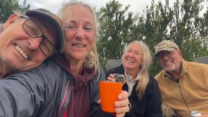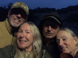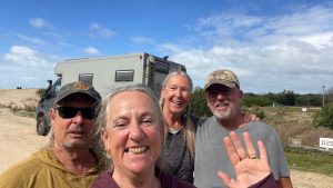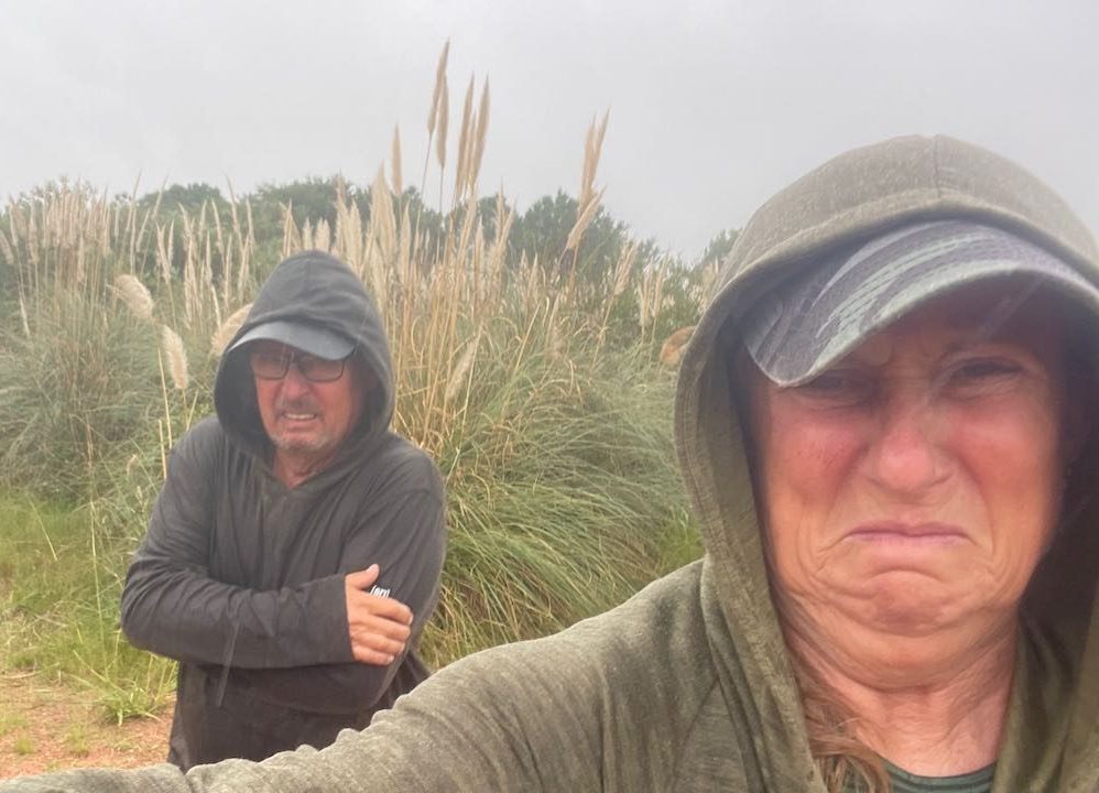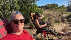 Wieder zurück sitzen wir zusammen mit Carola und Billy, vor dem Wind geschützt hinter Büschen.