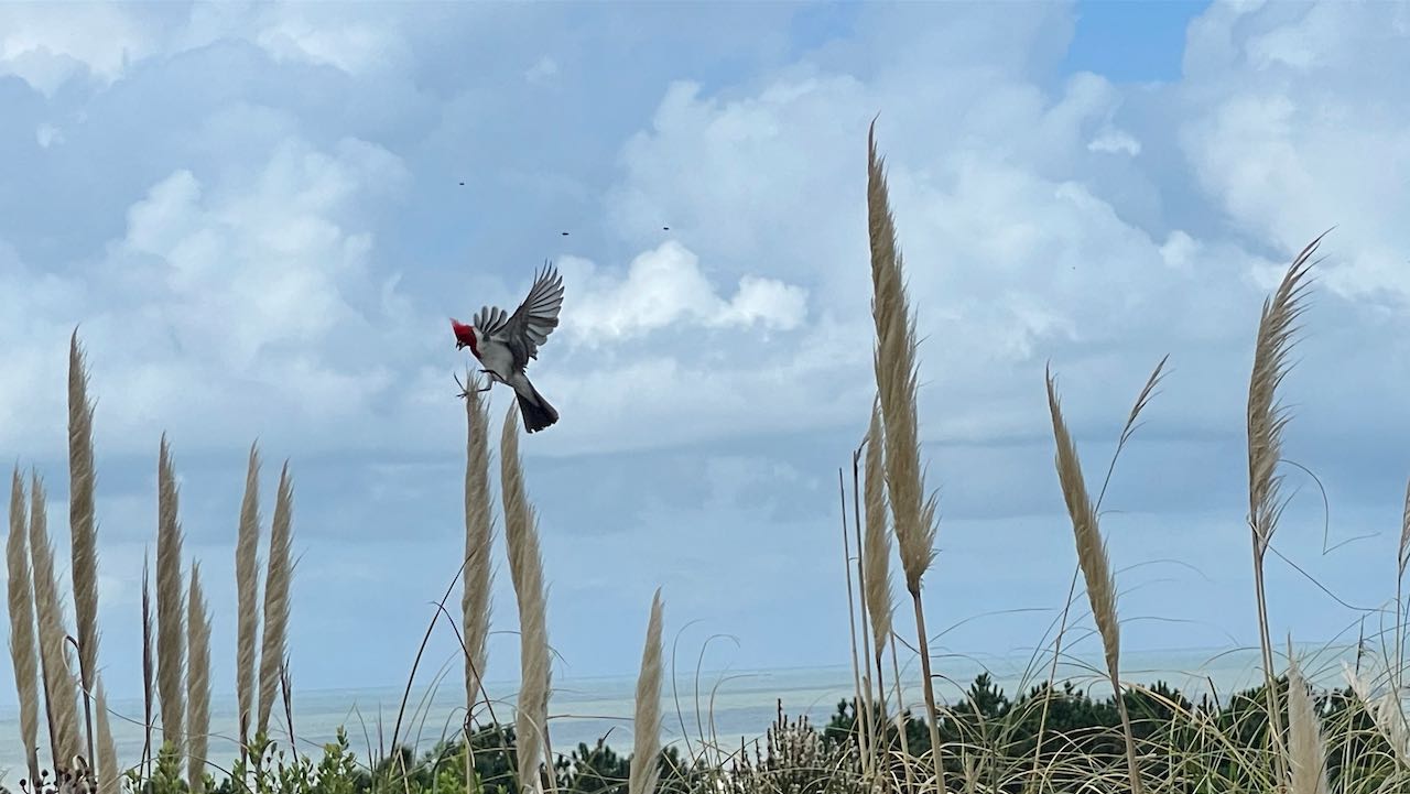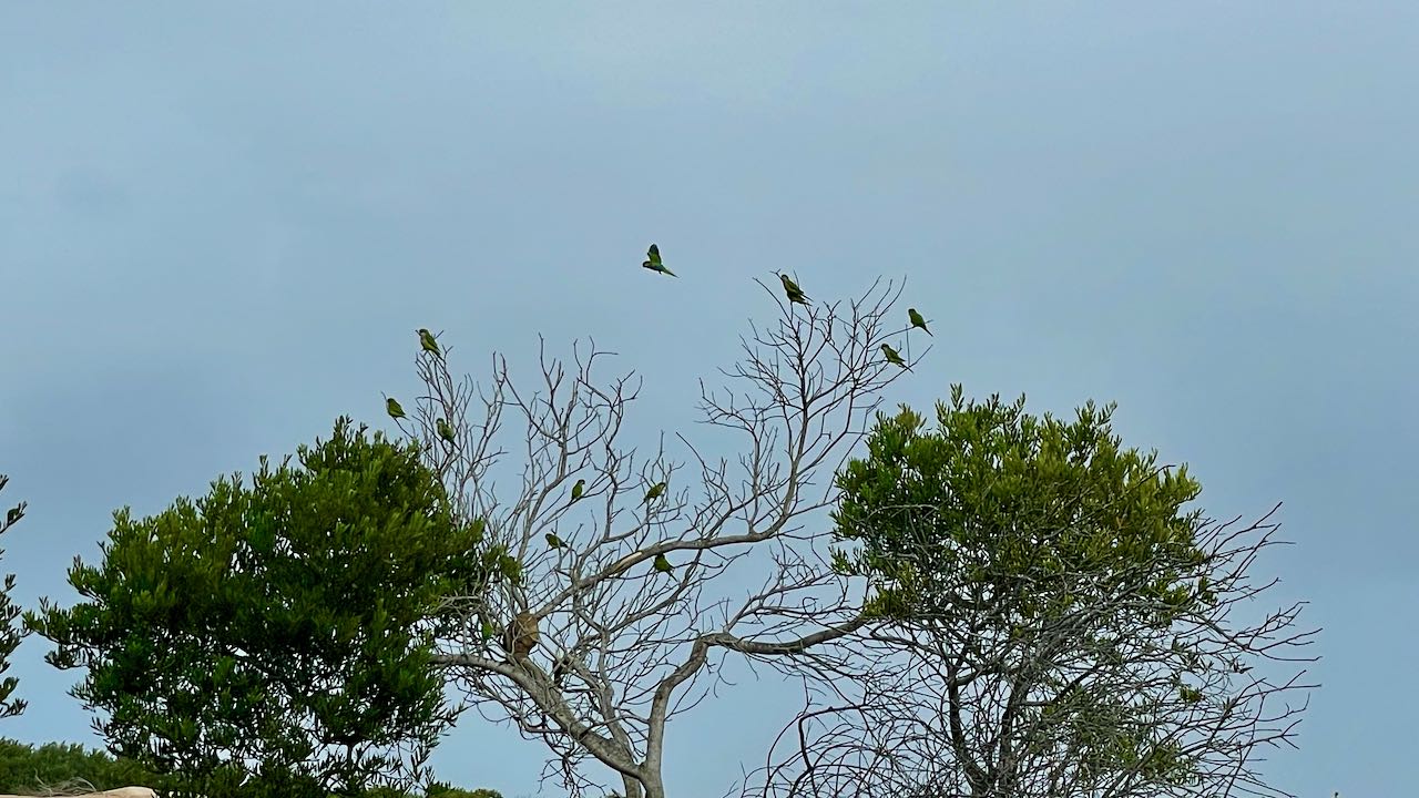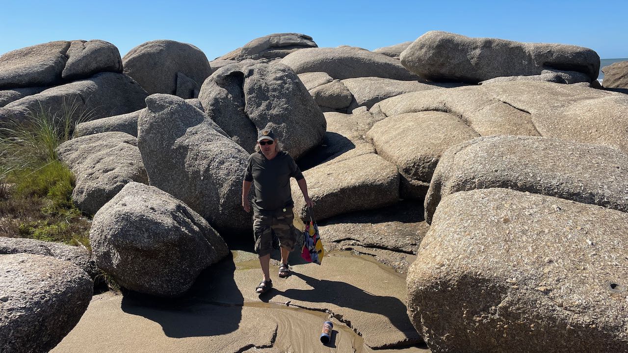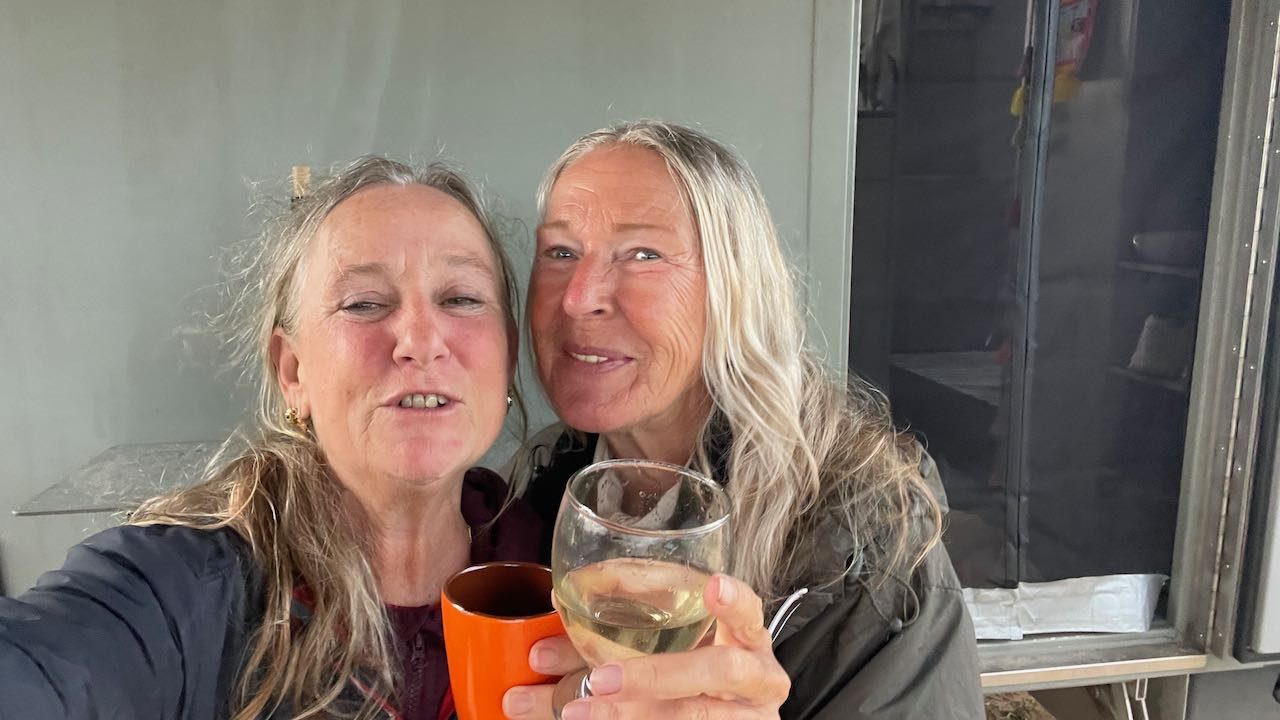 Wieder zurück sitzen wir zusammen mit Carola und Billy, vor dem Wind geschützt hinter Büschen.