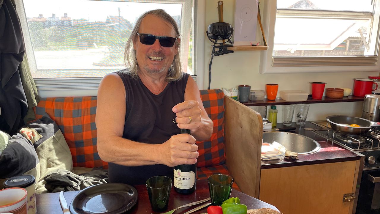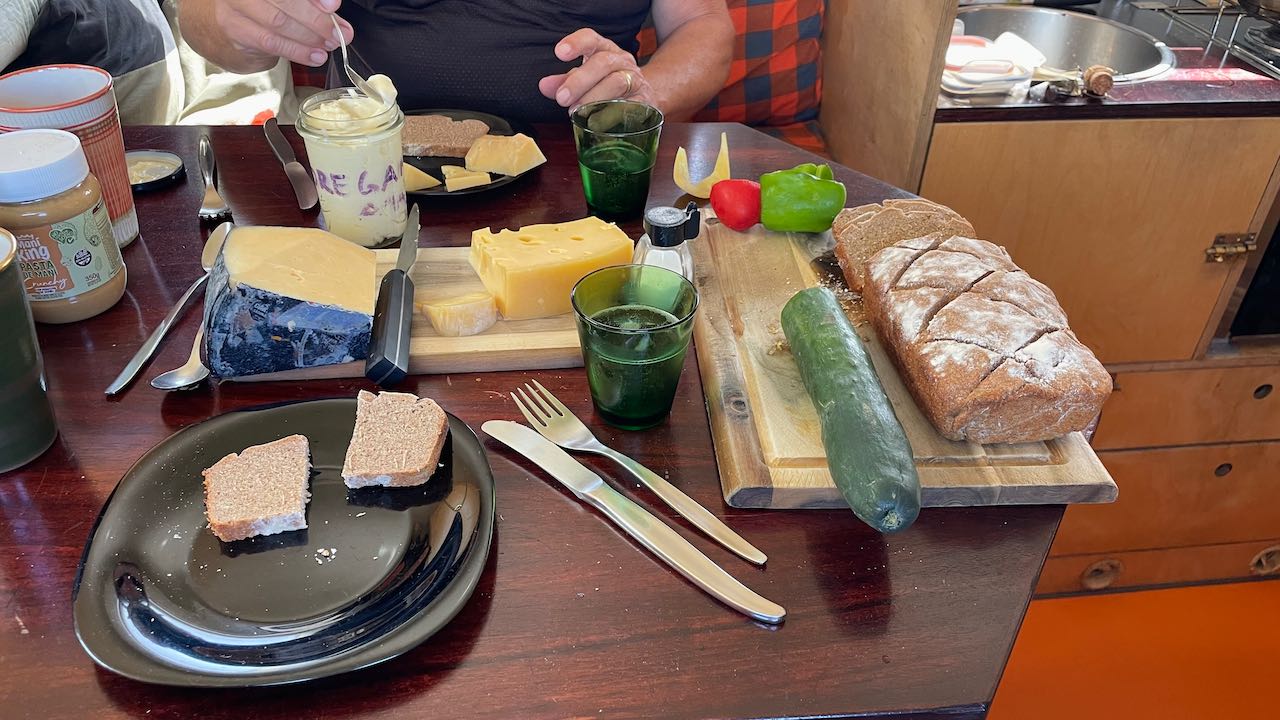 Ein Luxusfrühstück mit selbstgebackenem Roggenbrot und Schampus, den wir noch von der Antarktis Tour von der SH Diana mitgebracht haben.