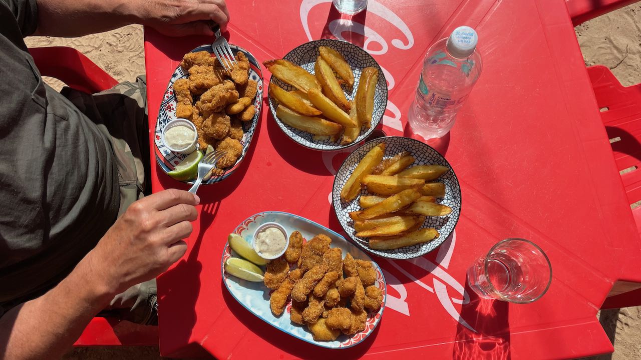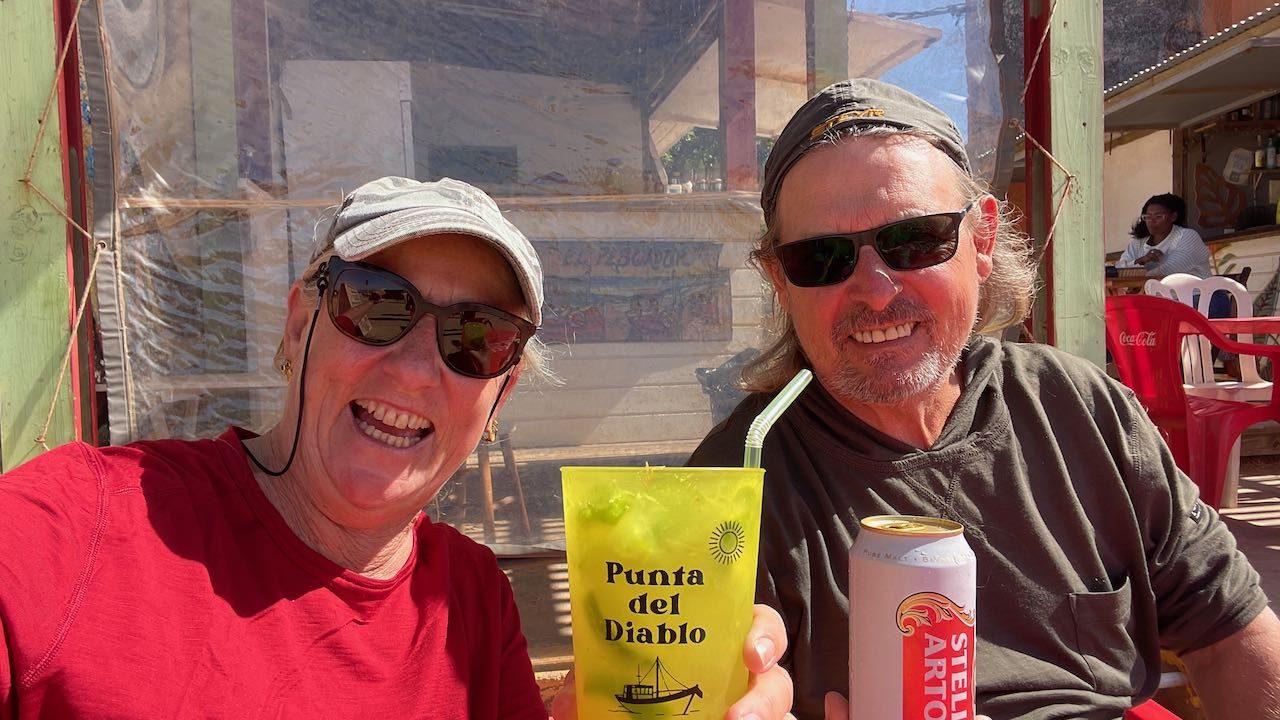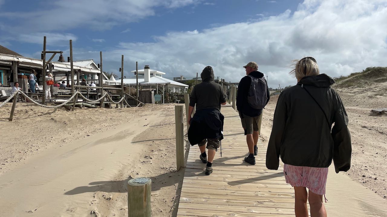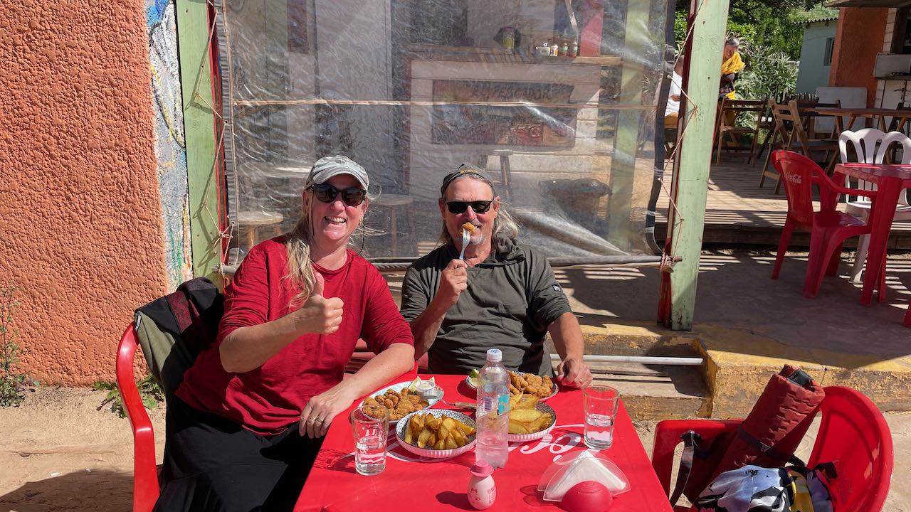Carola und Billy kennen ein gutes Restaurant. Über den Strand laufen wir in den Ort.