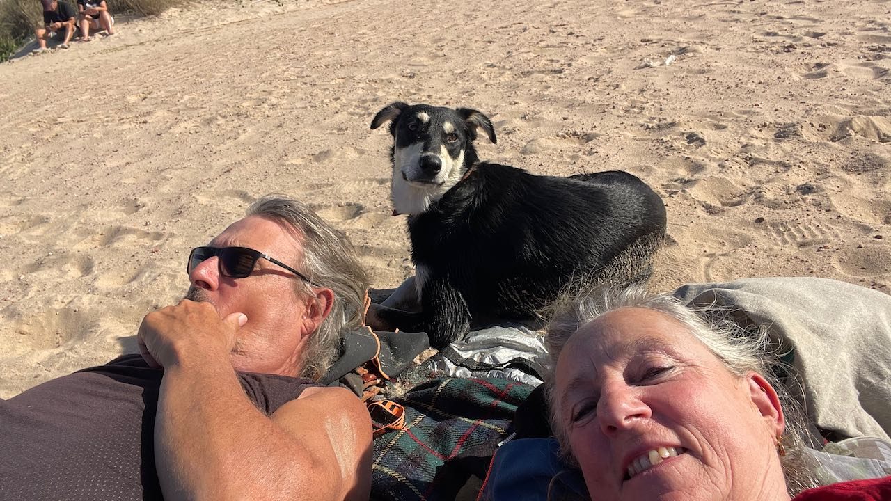 Mittagspäuschen am Strand. „Plumps!“ lässt sich ein süßer Hund bei uns nieder und leistet uns eine Weile Gesellschaft