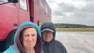 Am nächsten Morgen stecken wir voll im Mistwetter. Regenprasseln und Wind auf Sturmstärke.