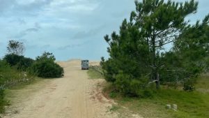 Über Matschepiste schaukeln wir durch Pinienwald, hier und da stehen schicke Villen. Wir verfransen uns einmal ganz fürchterlich in eine Tiefsandsackgasse und müssen rückwärts wieder raus.