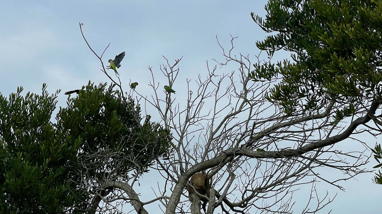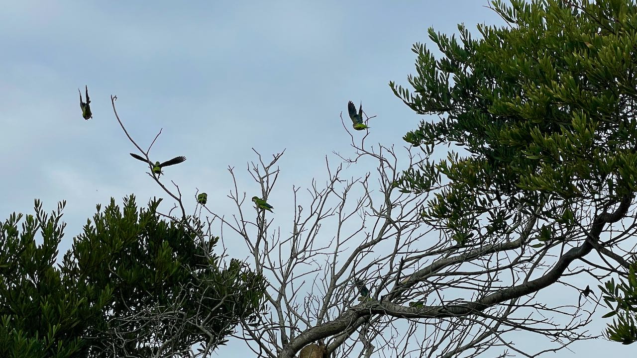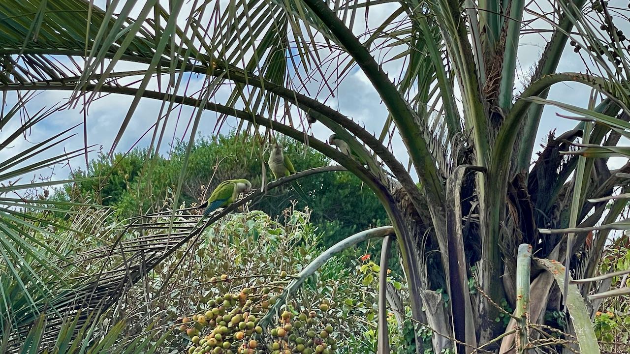 Mantelkardinäle flattern herum, Loros glucksen in den Palmen