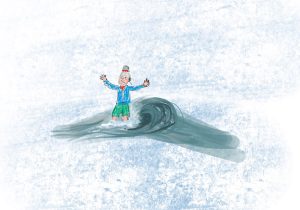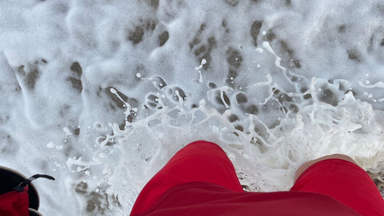 als Platsch! eine Welle von hinten heranrollt und mich erwischt. Meine Hose ist nass bis zum Hintern.