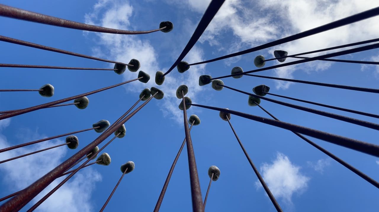 Wind lässt die Stäbe dieser Skulptur leicht hin- und herschwingen, die Steine klicken leise aneinander