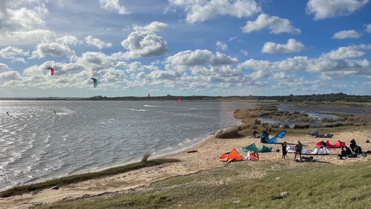Die Strasse verläuft zwischen Meer und Lagune. Rechts treibt der Wind die bunten Segel der Kitesurfer über die Lagune, links branden die Wellen des Atlantiks auf den hellen Sandstrand