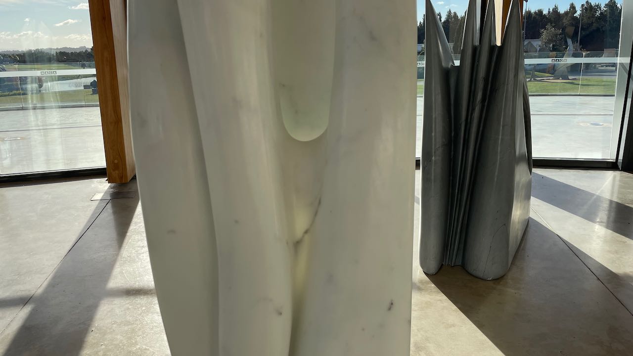Ein kurzer Weg durch den Garten bringt uns in einen lichtdurchfluteten Pavillon mit Bildhauerarbeiten. Ganz zart schimmert Licht durch den Marmor
