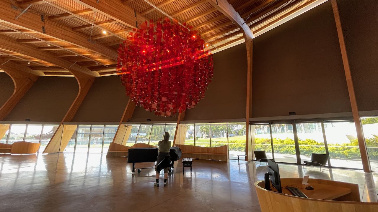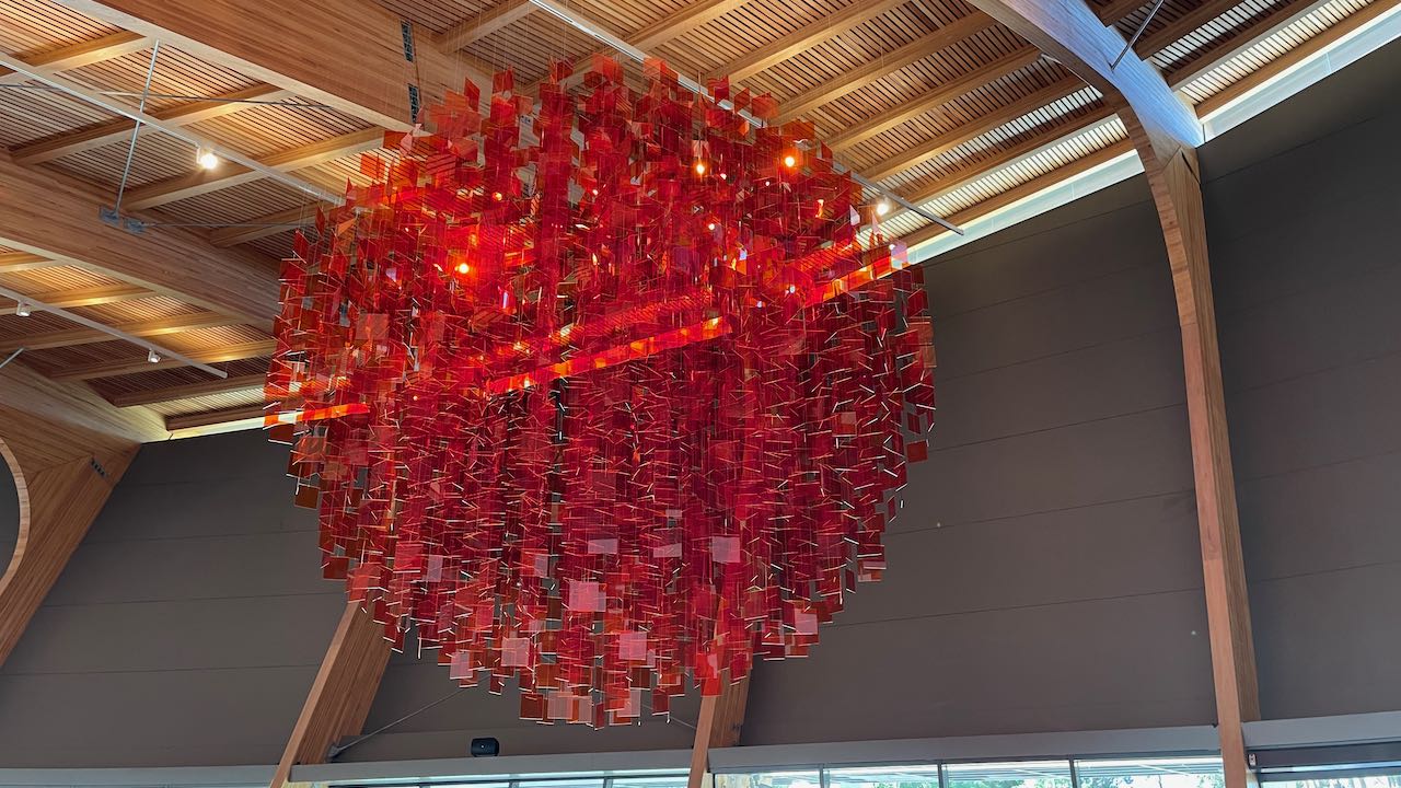 Wie eine rote, leichte Wolke schwebt der Kronleuchter durch den Raum
