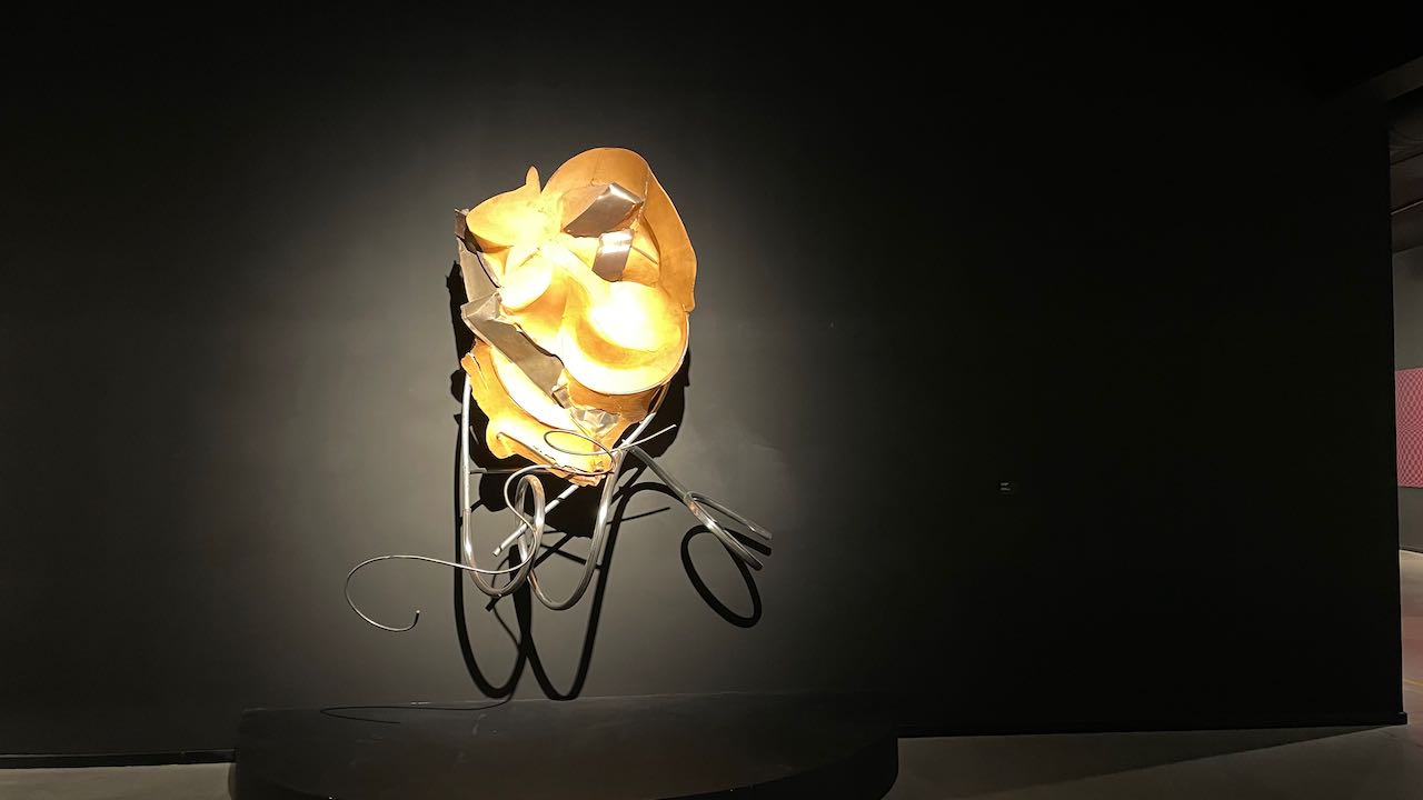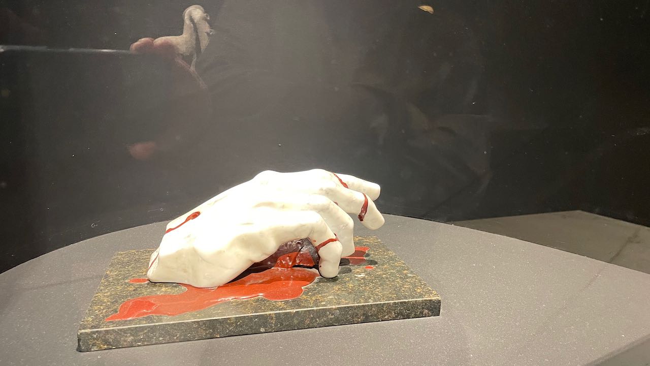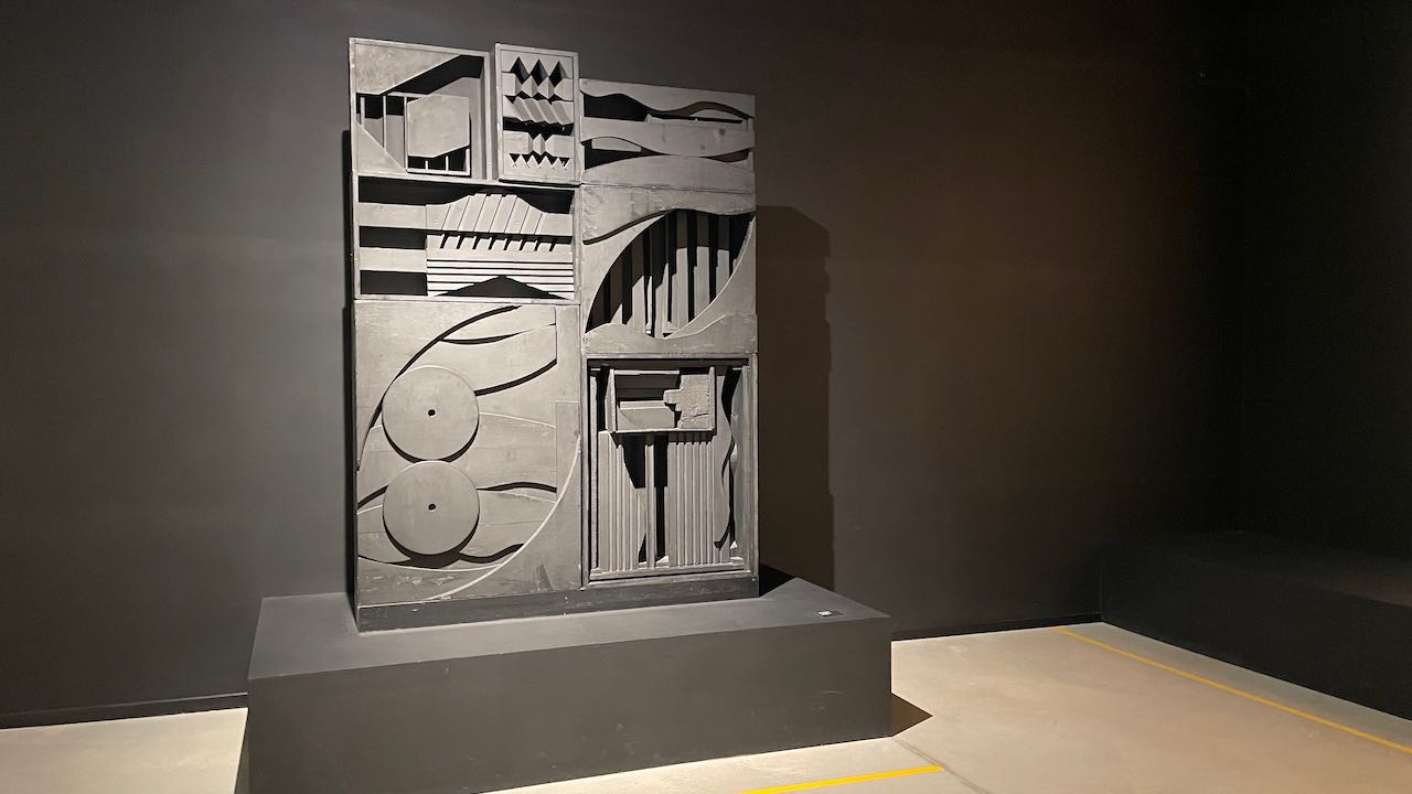 Ein dunkel gestrichener Raum mit Atchugarrys Bildhauerei, teils etwas gruselig