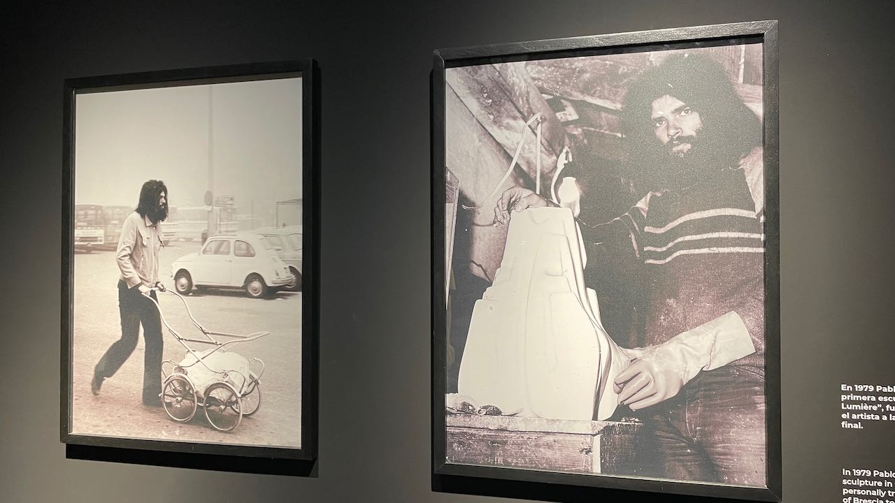 Ein paar Fotos zeigen den Künstler selbst. 25 Jahre alt, in Italien, Carrara Marmorblöcke für seine Skulpturen mit dem Kinderwagen durch die Gegend schiebend.
