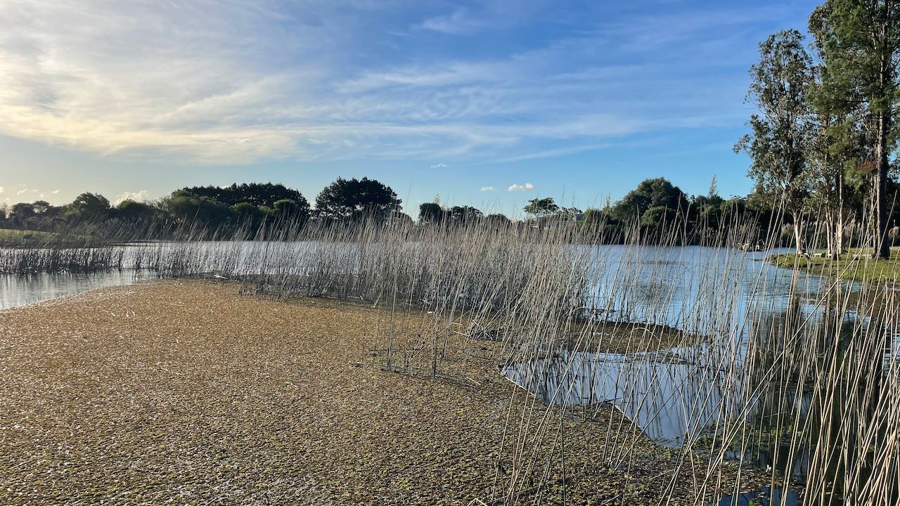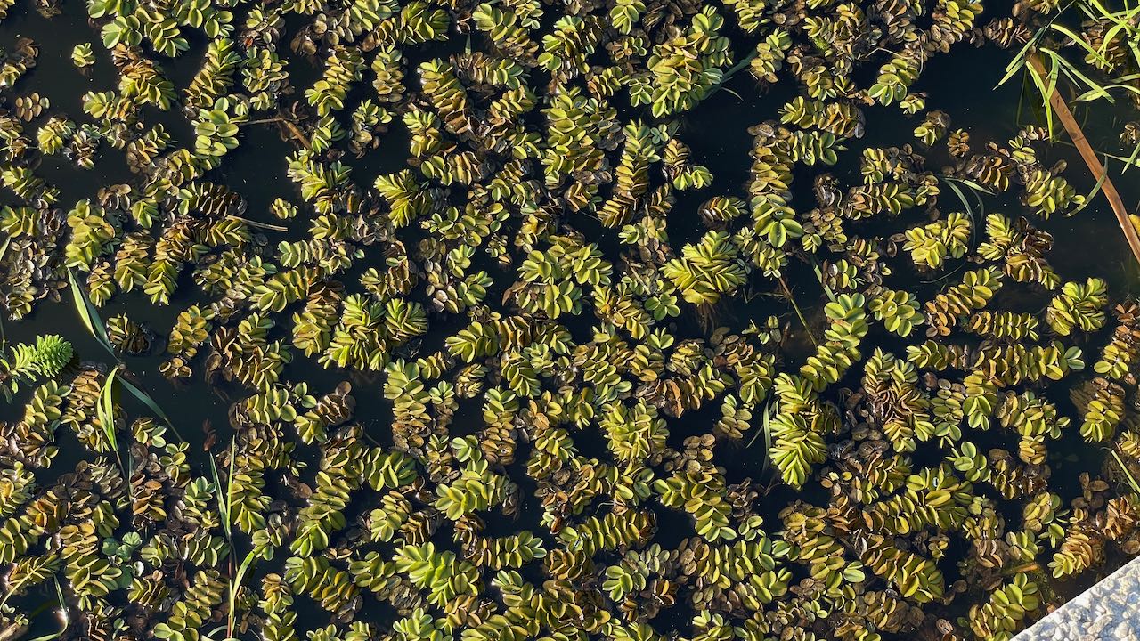 Ein dichter Teppich aus Wasserpflanzen bedeckt den See, eine Brücke führt hinüber.
