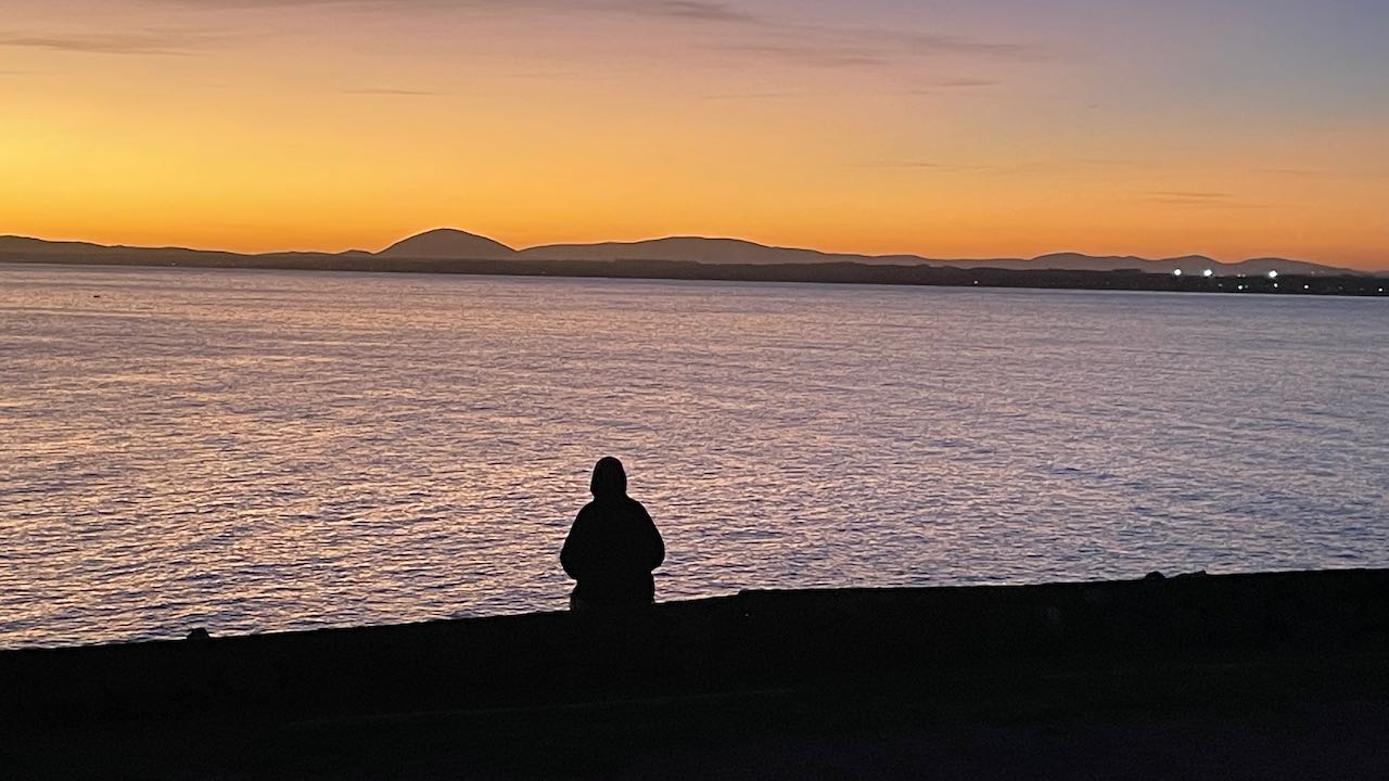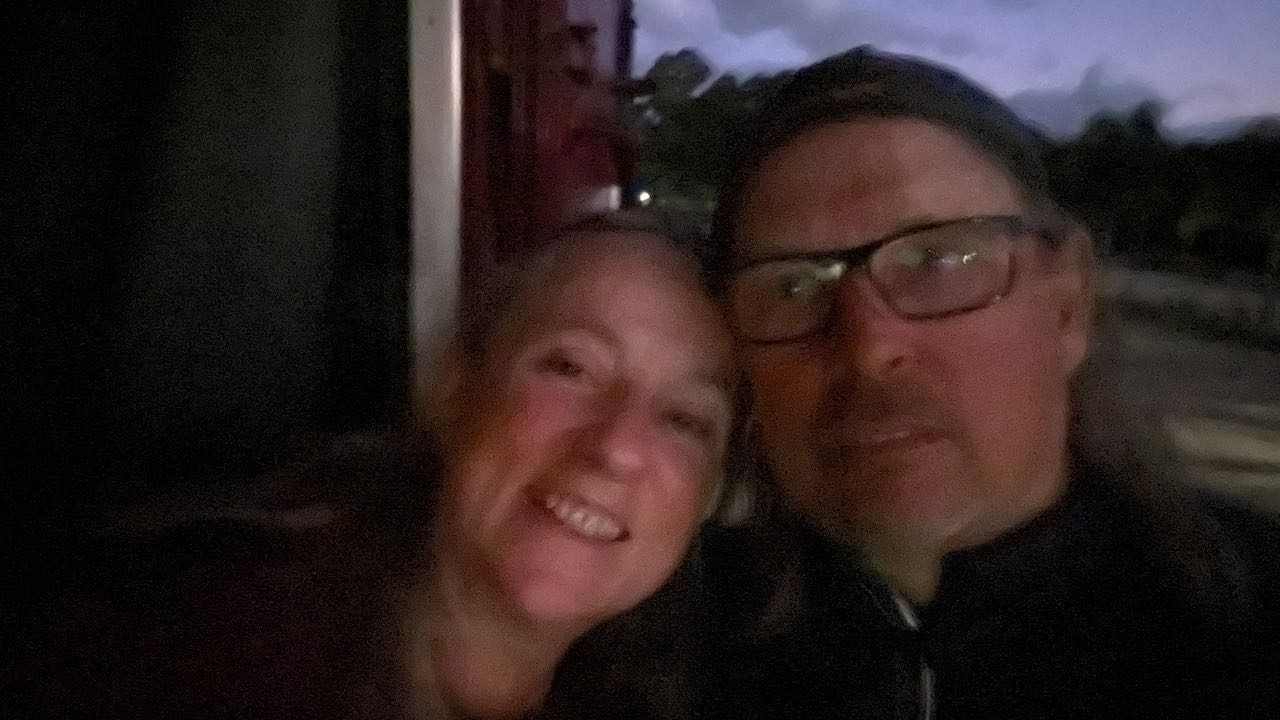Im Dunklen sitzen wir auf der Treppe und freuen uns, daß wir diesen schönen Nachmittag hatten, mit dem schönen Licht.