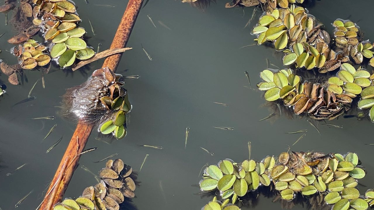 Huch?! Die Gärtner haben heute morgen fast alle Wasserpflanzen entfernt, winzige Fischlein huschen im See hin und her
