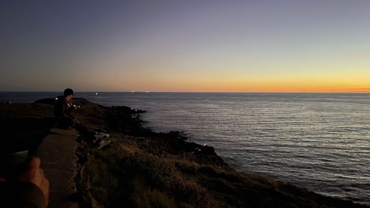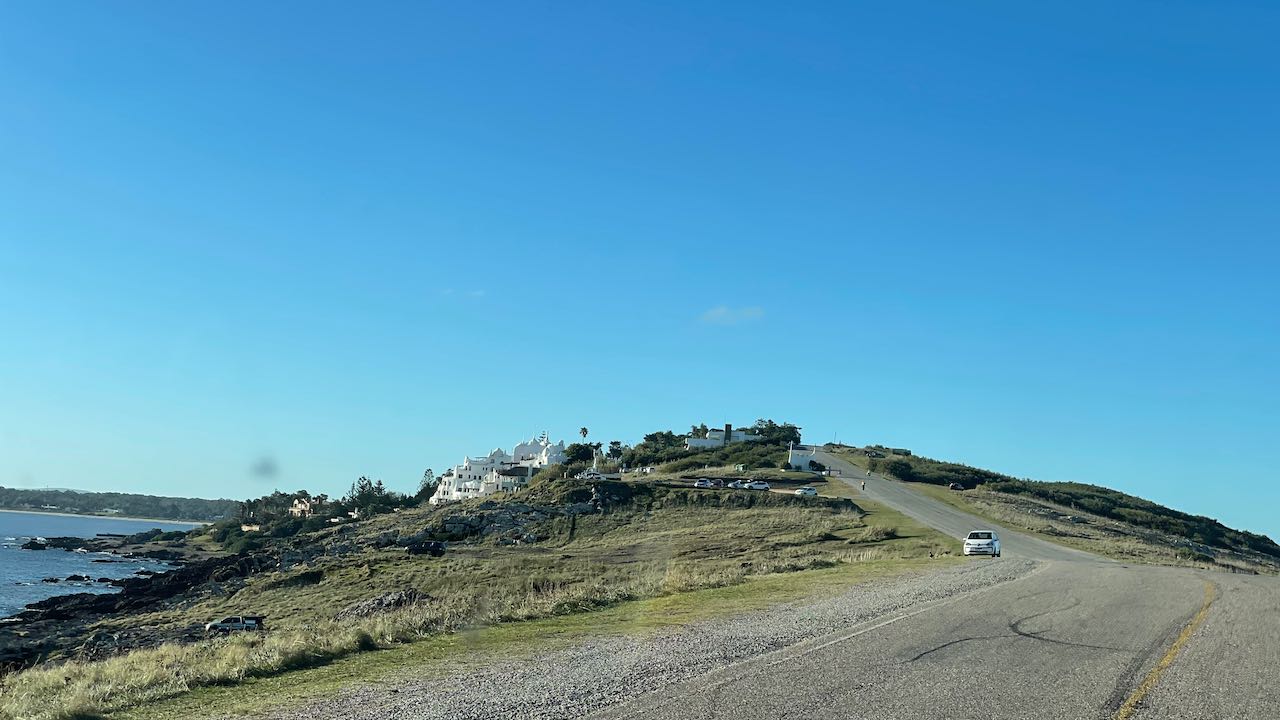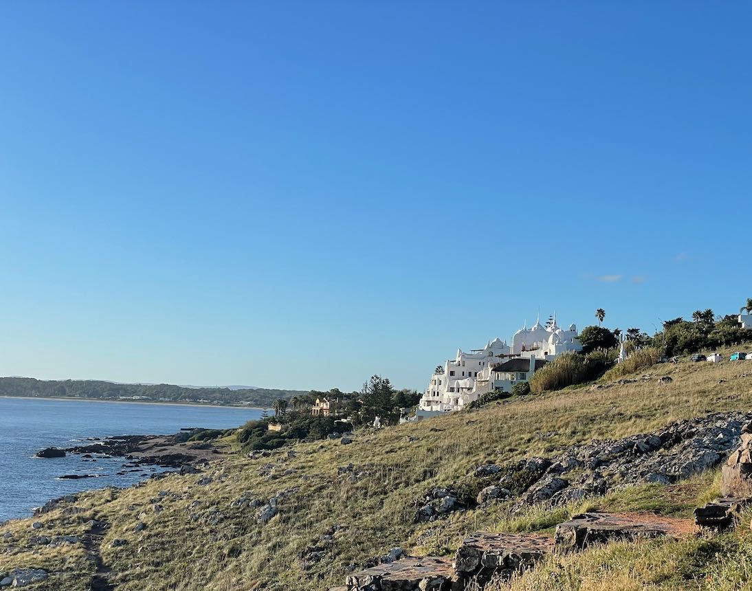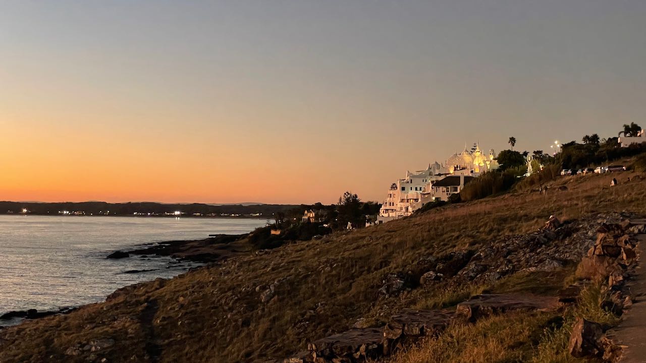 Im Osten glitzern die Lichter von Punta del Este, viele Leute kommen zum angeln und zum Sonnenuntergang. Die weißen Mauern der Villa Páez-Vilaró reflektieren den Abendhimmel